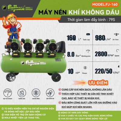 Máy nén khí FUJIWA 160 LÍT – KHÔNG DẦU NHANH TUA